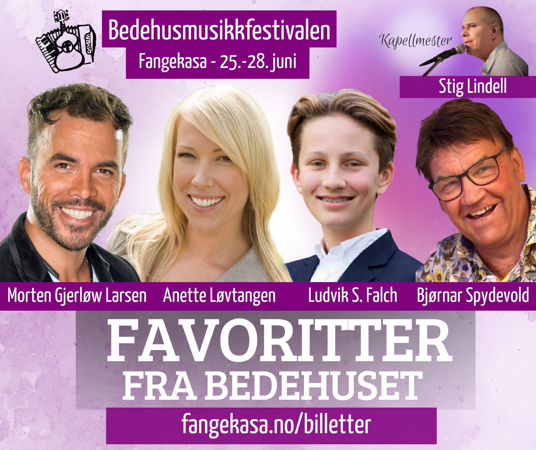Fredag 26. juni kl. 19.00: "Favoritter fra bedehuset" med Morten Gjerløw Larsen, Anette Løvtangen, Ludvik Svarstad Falch og Bjørnar Spydevold. Husband v/ kapellmester Stig Lindell